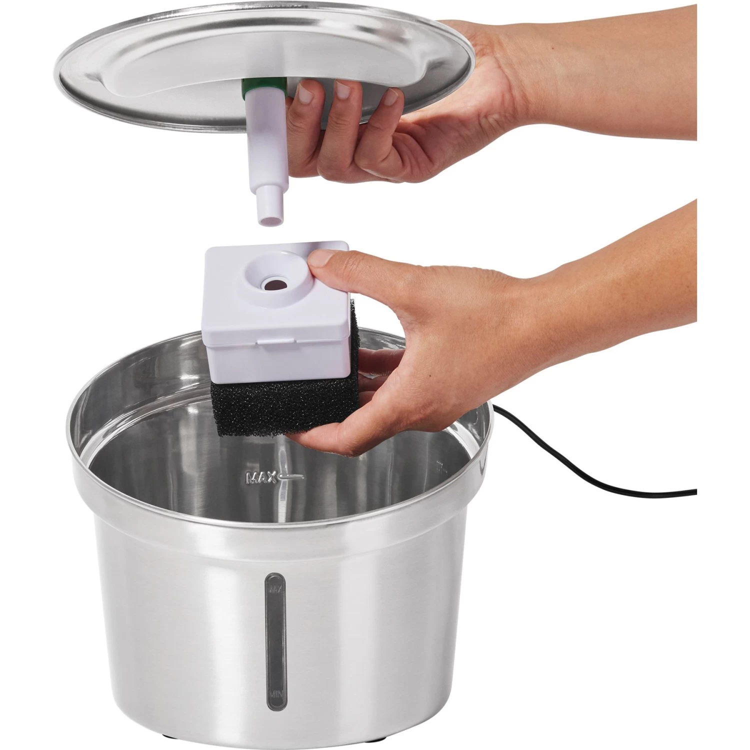 - Stainless-steel fountain can be washed with soap and warm water, so keeping it at peak performance is easy and convenient.